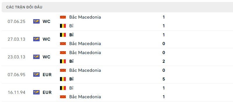 Xét về lịch sử đối đầu, tin bóng đá đưa tin hai đội đã gặp nhau tổng cộng 3 lần trong các kỳ vòng loại trước đây, với ưu thế nghiêng về Bỉ khi thắng 2 và hòa 1. Tuy nhiên, kết quả hòa ở lượt đi hồi tháng 7 năm nay là lời nhắc nhở rằng Bắc Macedonia không còn là một đội bóng dễ bắt nạt. Ở trận đó, Nicolas Raskin và Alexis Saelemaekers có những cơ hội ngon ăn trong hiệp một nhưng không thể tận dụng từ phía Bỉ, để rồi đến phút 86, Ezgjan Alioski tung cú vô-lê sấm sét từ đường chuyền của Churlinov, ấn định tỉ số 1-1 và mang về một điểm quý giá cho Bắc Macedonia.