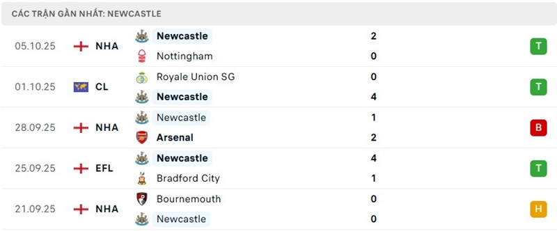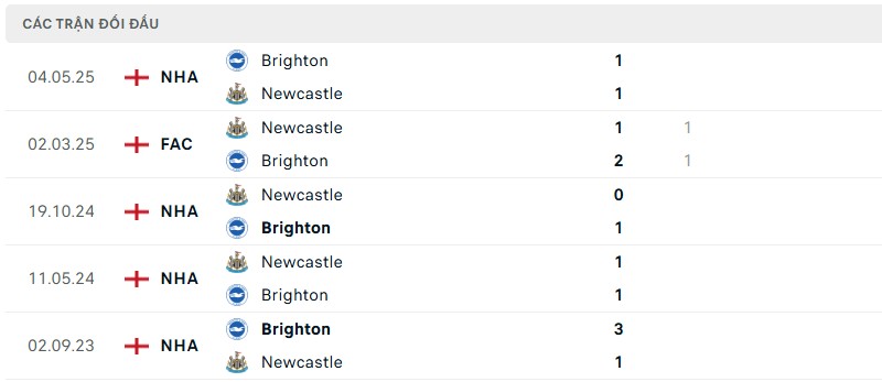 Trong 5 trận gần nhất, đội bóng áo xanh trắng bất bại, giành tới 3 chiến thắng và hòa 2. Mùa trước, họ từng cầm hòa 1-1 trên sân Amex vào tháng 5/2025 khi Alexander Isak ghi bàn gỡ hòa muộn từ chấm 11m, và trước đó, Brighton cũng loại Newcastle khỏi FA Cup với chiến thắng 2-1 ngay tại St James’ Park.