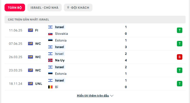 Phong độ thi đấu của Israel vs Italia đều đang nỗ lực để củng cố vị trí trên bảng xếp hạng. Phong độ gần đây của hai đội sẽ là yếu tố then chốt quyết định cục diện trận đấu.