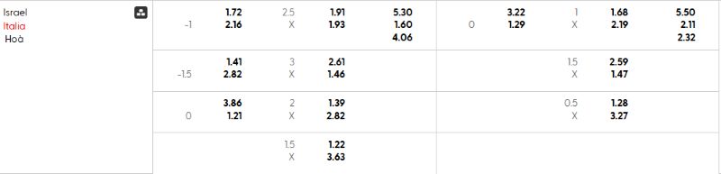 Italia được nhà cái xếp ở cửa trên với mức chấp 1 bàn. Với phong độ hiện tại, Azzurri hoàn toàn có khả năng vượt qua tỷ lệ này. Trong 3 trận gần nhất theo chuyên gia soi kèo Israel vs Italia, Italia thắng kèo châu Á tới 2 lần khi đối đầu các đội bóng yếu hơn. Ngược lại, Israel chỉ thắng kèo 1/5 trận gần đây, cho thấy sự bất ổn khi đối mặt với các đội mạnh.