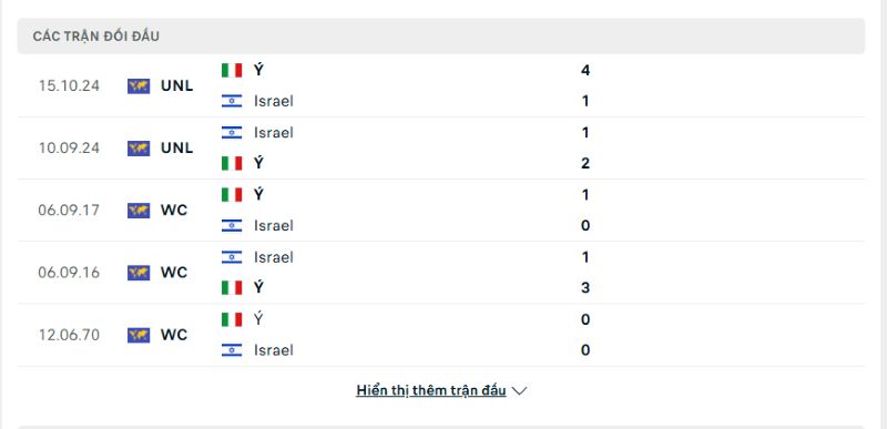 Soi kèo Israel vs Italia nghiêng hẳn về phía đội bóng áo thiên thanh. Trong 5 lần chạm trán gần nhất, Italia thắng 4 trận và hòa 1 trận không để Israel có cơ hội tạo bất ngờ. Trận đấu gần đây nhất tại UEFA Nations League 2024/2025 chứng kiến Italia vượt qua Israel với tỷ số 4-1. Những con số này cho thấy sự chênh lệch về đẳng cấp giữa hai đội.