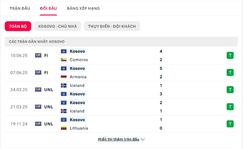 Thành tích đối đầu giữa Kosovo vs Thụy Điển