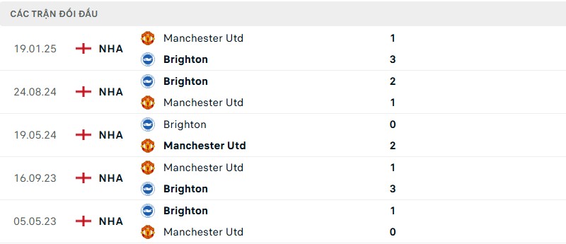 Thành tích đối đầu giữa Manchester United vs Brighton