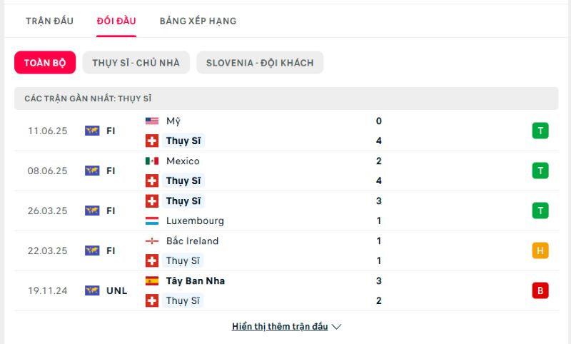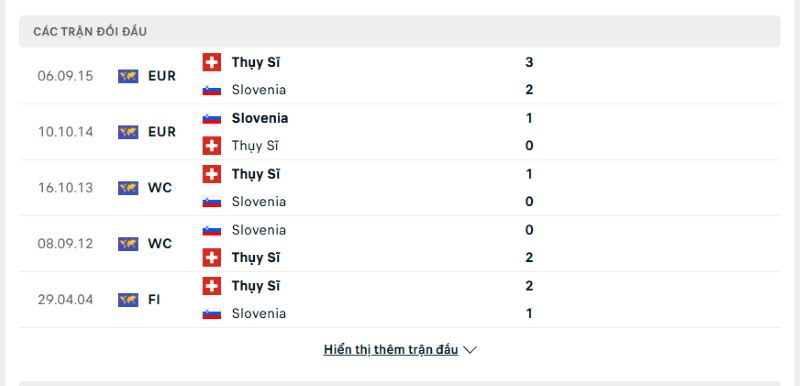 Thành tích đối đầu giữa Thụy Sĩ vs Slovenia
